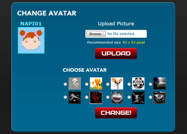Klik menu PROFILE dan klik UBAH AVATAR hanya bisa JPG, GIF dan PNG Extension. Maximal size 100KB
