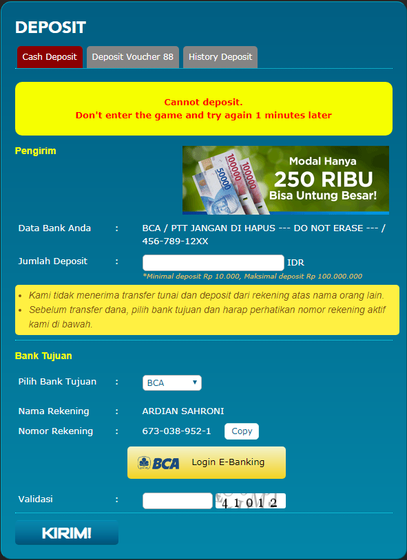 - Selalu memperhatikan rekening tujuan yang tersedia di menu deposit. Apabila rekening tidak terlihat di menu deposit jangan melakukan transfer dana kerekening tersebut. Rekening aktif adalah rekening yang terlihat di menu deposit.